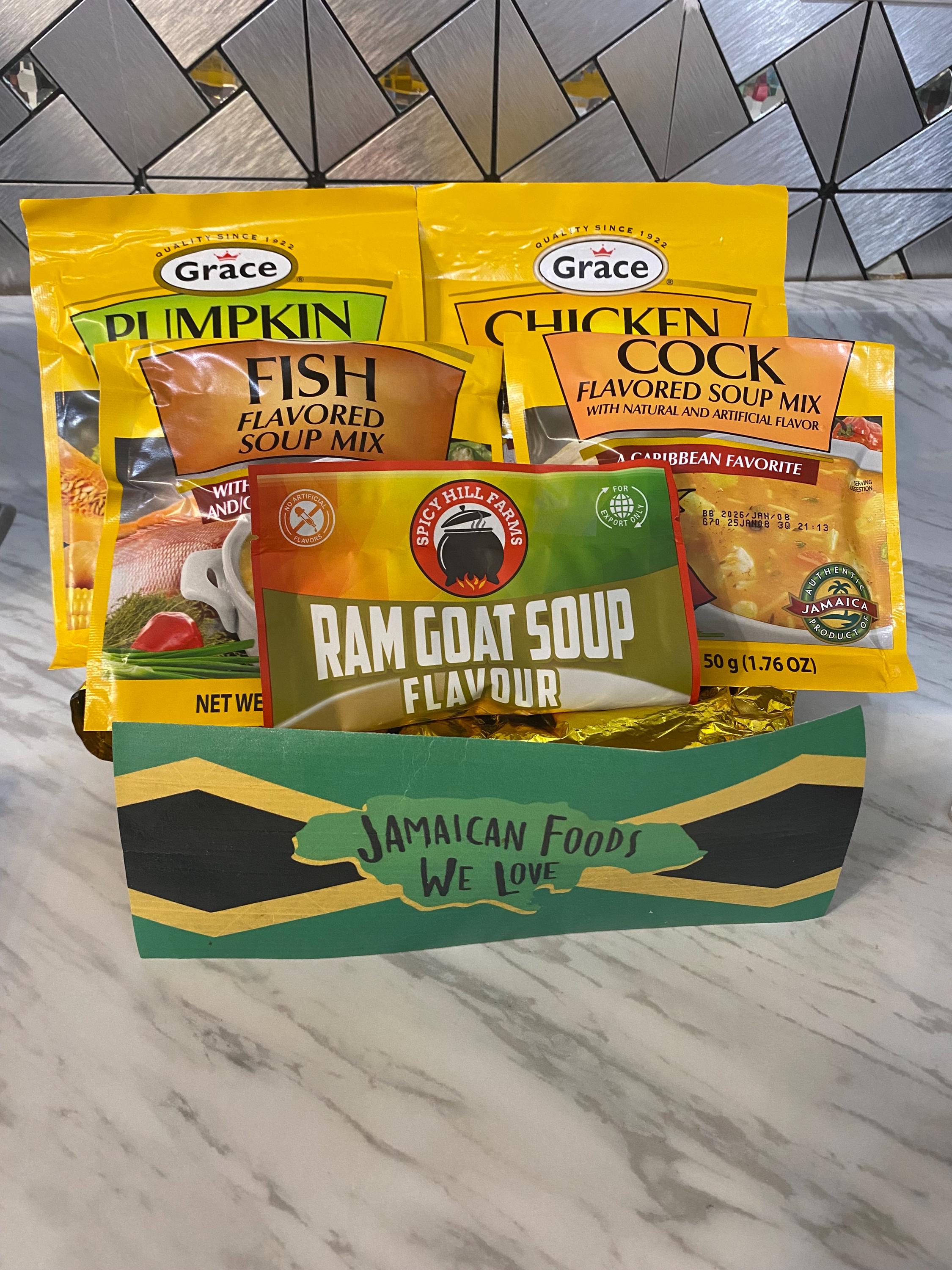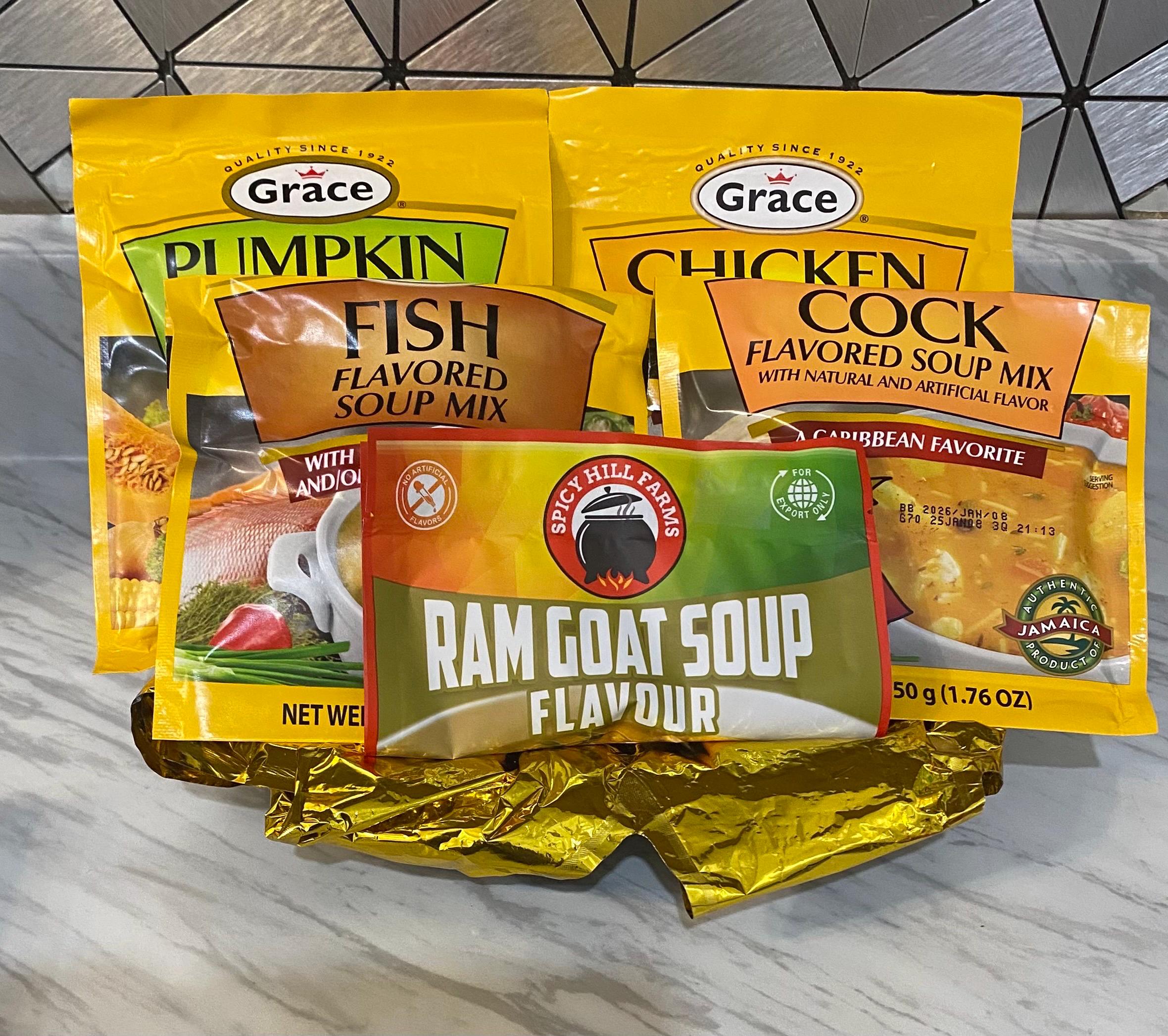 Your favorite soup flavors all in one basket!Basket includes Grace Pumpkin, Chicken, Fish & Cock Soups & Home Choice Ram Goat Soup flavor.Cozy up to these soup flavors to remind you of days gone by and family traditions.